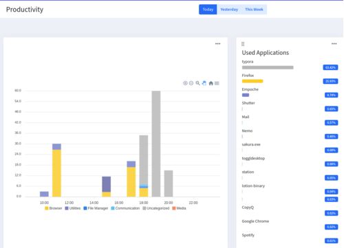 「1時間のうち、ブラウザを見ていたのは何分」まで判明 しばらくEmpocheのデスクトップアプリ版を使ってみた。 プロダクティビティの画面に行くと、こんな感じで表示される!すごい! 左が1時間ごとにどのカテゴリのアプリを使っていたのかを表した棒グラフ…
