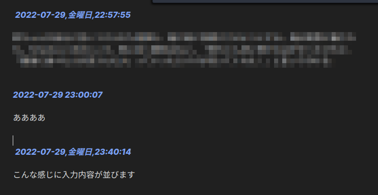 自分の場合は「日付.拡張子」が「yyyy-mm-dd.md」というマークダウンファイルになっていて、「日付+時間(太字)+入力内容」という形で追記しています。